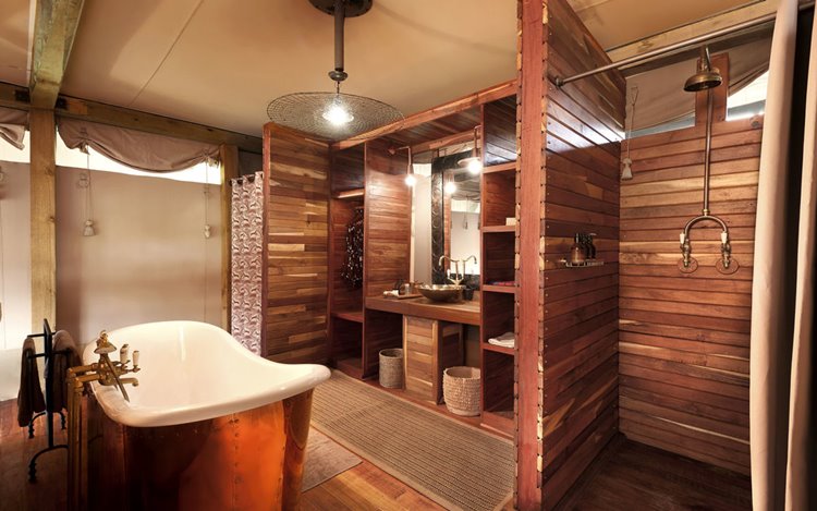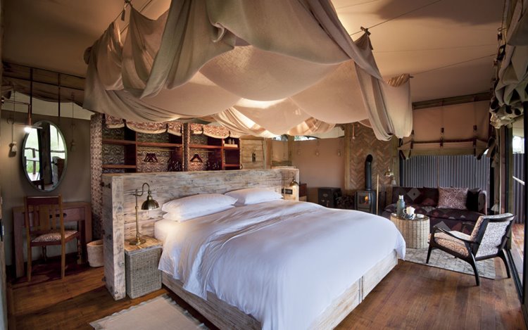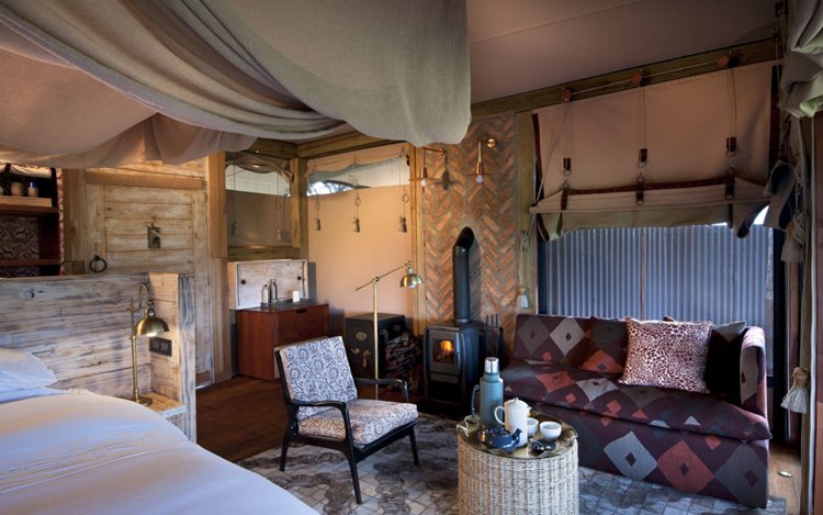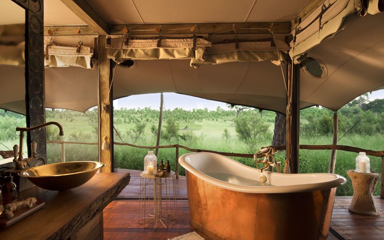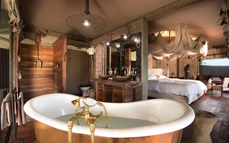 El campamento está compuesto por un reducido número de tiendas de lona de estilo clásico, construidas sobre plataformas de madera y decoradas con un diseño que mezcla el encanto colonial con un toque contemporáneo. Cada tienda dispone de camas king size, baño en suite con ducha interior y exterior, y terraza privada con vistas a la llanura. Desde allà es habitual ver elefantes acercarse a los pozos de agua del campamento, un espectáculo que ha convertido a Somalisa en un lugar emblemático dentro de Hwange.