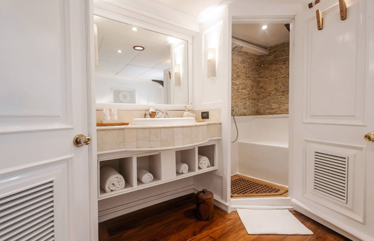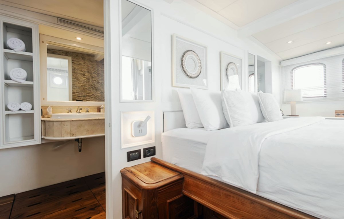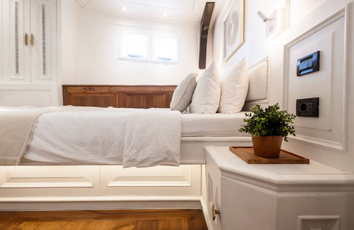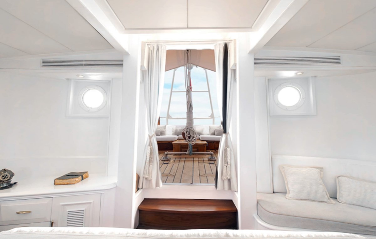 Sus dos imponentes mástiles ofrecen una vista impresionante, mientras que su interior cuenta con siete lujosas cabinas adornadas con cálida madera de teca.