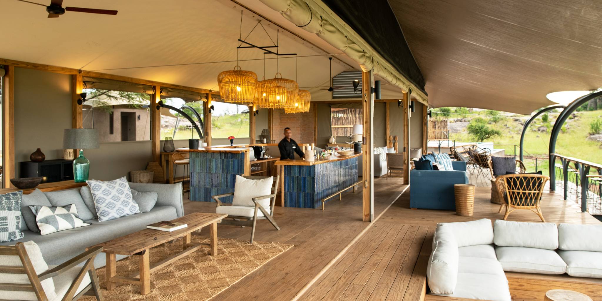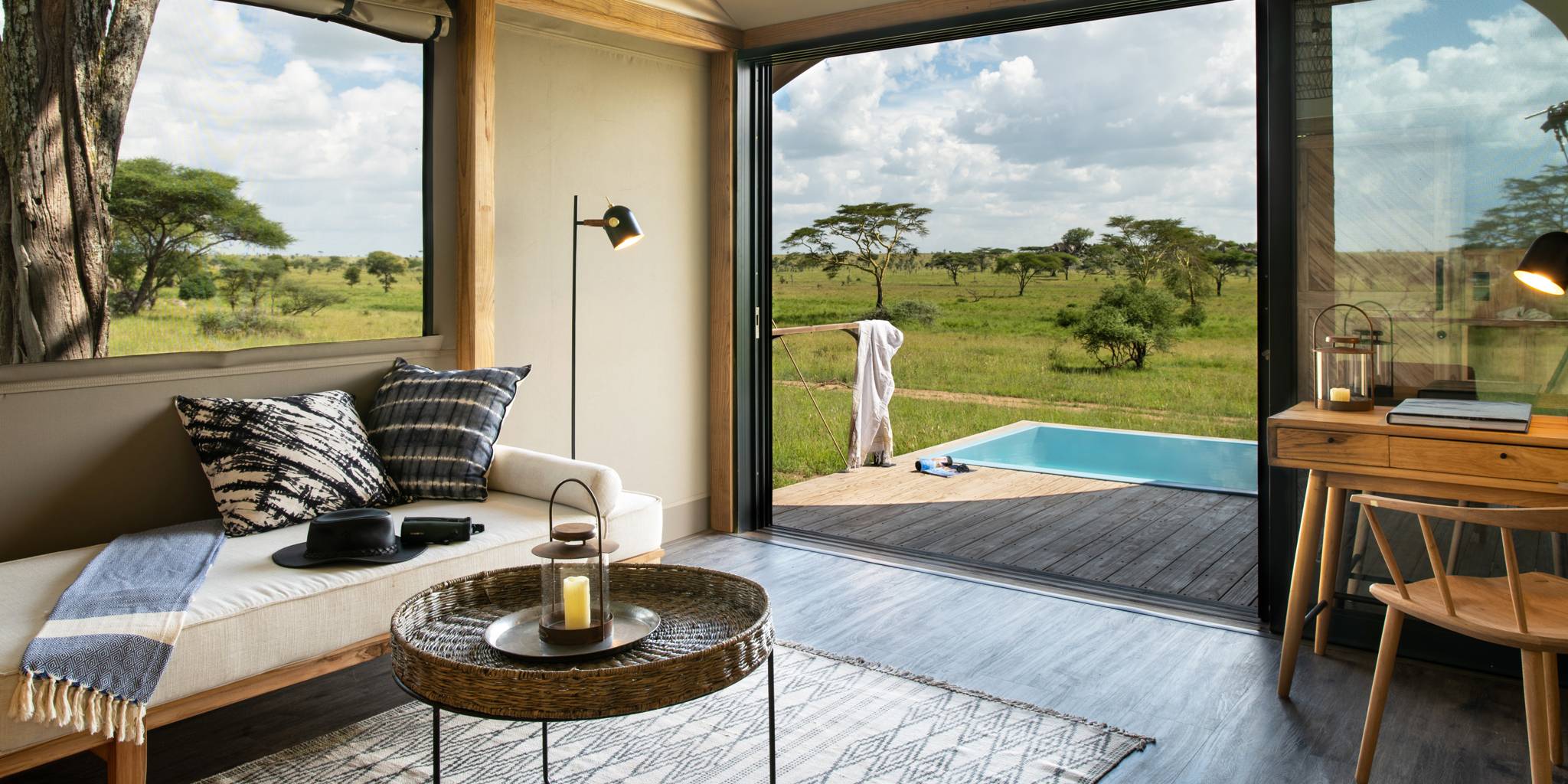 El diseño del lodge combina paredes de lona, techos altos tipo catedral y amplias terrazas de madera, creando una atmósfera contemporánea y luminosa. Las áreas comunes incluyen un salón, comedor, bar, piscina principal y una terraza de observación al aire libre, perfectas para relajarse después de un dÃa de safari.